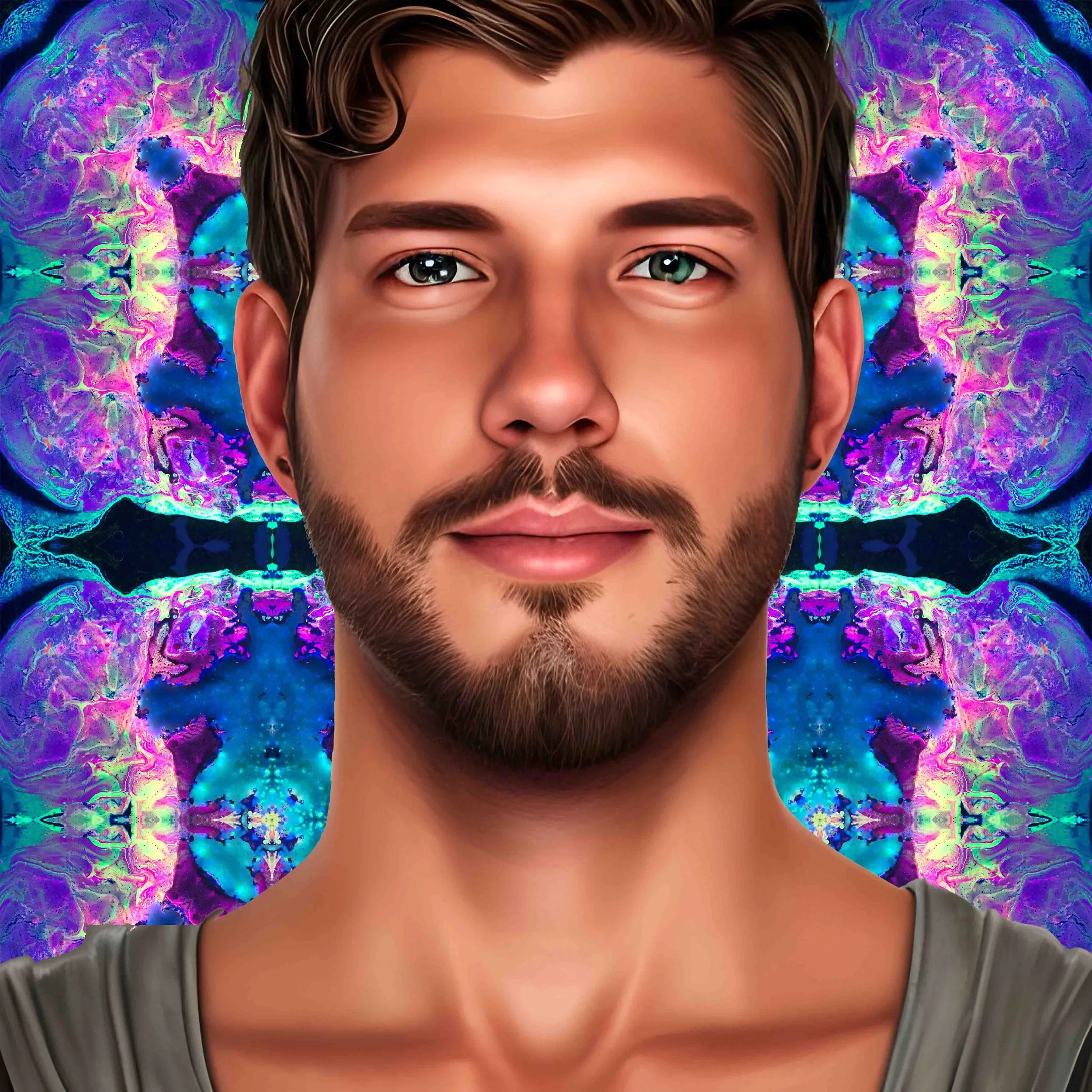 Through mirrored color systems and cosmic forms, each work invites the viewer into a pareidolia experience where galaxies, eyes, creatures, and unknown worlds begin to emerge from symmetry.